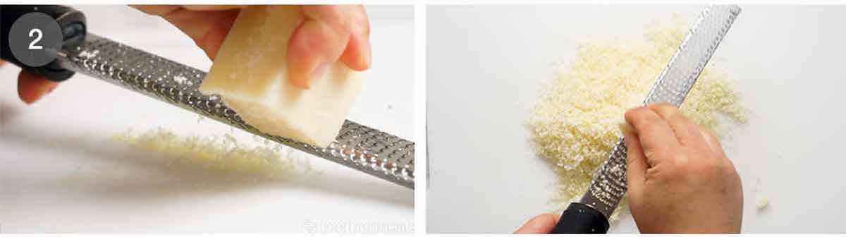 Finely grate the parmigiana reggiano or pecorino. I use a microplane – one of can’t-live-without kitchenware items!