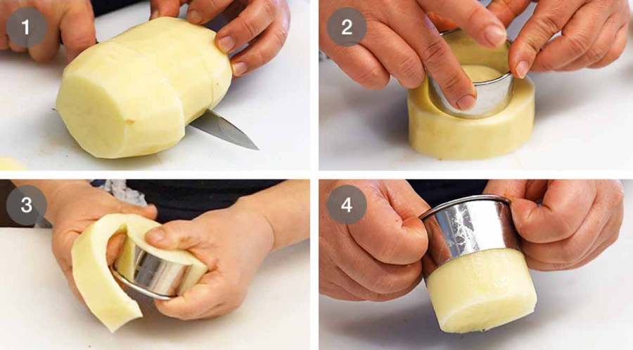- Carve / cut each potato into cylinders ~ 6cm/ 2" diameter, 7 cm height. Then cut in half so you have 8 short cylinders 3.5 cm / 1.4" tall. See cutting method options below.