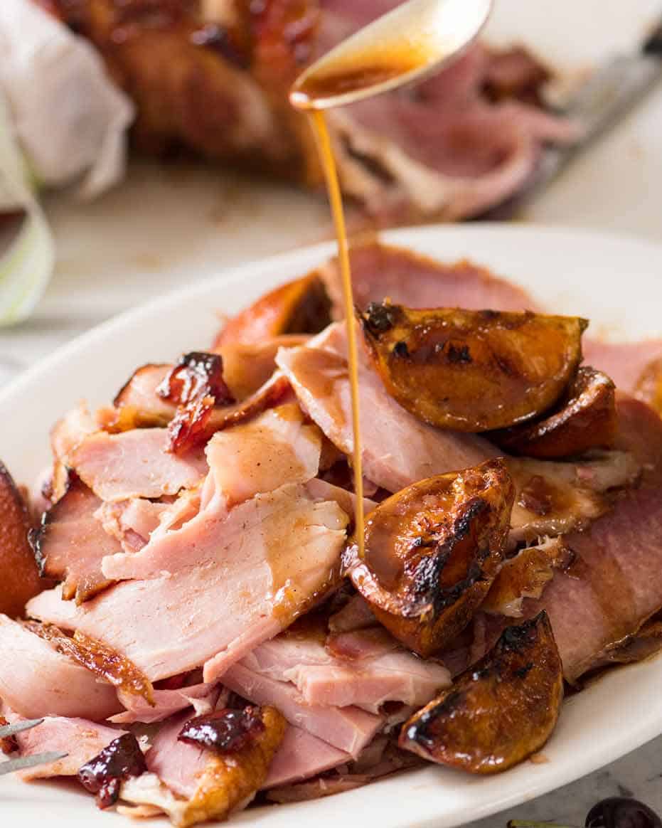 I used to serve ham with sauces like Cranberry Sauce, mustard, caramelised onion jam and even chutney. But then one day it dawned on me – everybody’s favourite part is the glaze. Why not just use the pan drippings which is just the excess glaze that drips down the ham into the pan? Combined with the ham juices and orange juice, it transforms into a fantastic sauce to drizzle over the ham!