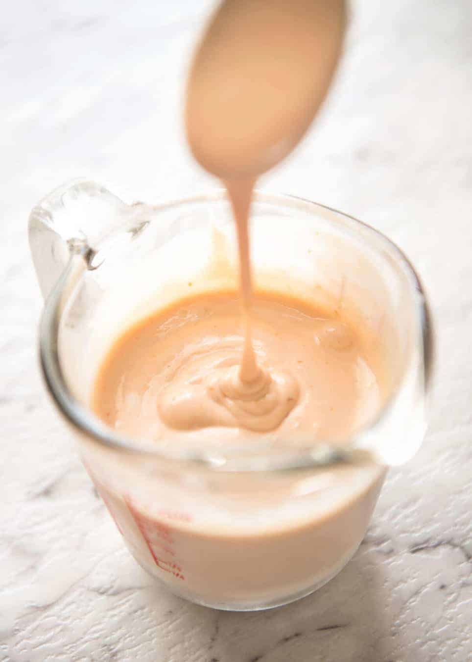 I use Neil Perry’s recipe (he’s a famous restauranteur in Australia). Fab for prawn cocktails but also a great sauce generally for dipping in fresh prawns (here are 5 more Prawn Dipping Sauces!), or crunchy Coconut Crumbed Prawns, chicken fingers/nuggets, wings, and using on burgers (Beef Burgers, Chicken Burgers, Portuguese Chicken Burgers, Steak Sandwiches and Veggie Burgers).